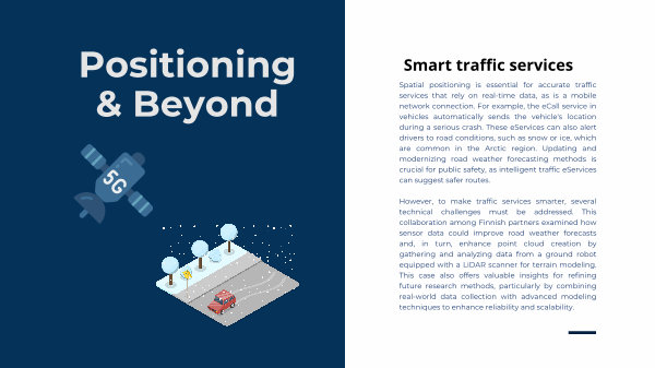 Spatial positioning is essential for accurate traffic services that rely on real-time data, as is a mobile network connection. For example, the eCall service in vehicles automatically sends the vehicle ' s location during a serious crash. These eServices can also alert drivers to road conditions, such as snow or ice, which are common in the Arctic region. Updating and modernizing road weather forecasting methods is crucial for public safety, as intelligent traffic eServices can suggest safer routes.