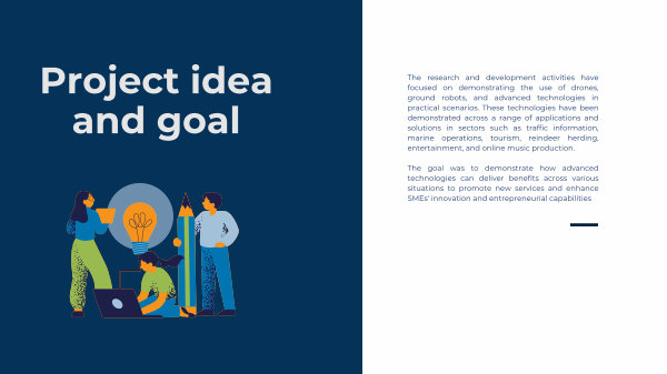 The research and development activities have focused on demonstrating the use of drones, ground robots, and advanced technologies in practical scenarios. These technologies have been demonstrated across a range of applications and solutions in sectors such as traffic information, marine operations, tourism, reindeer herding, entertainment, and online music production.