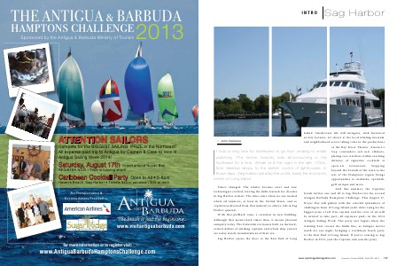 Island. Small-town life still intrigues, with historical society lectures, art shows at the local whaling museum by John Galluzzo and neighborhood actors taking roles in the productions of the Bay Street Theater. America’s t took a long time for Americans to go from whaling to whale Cup contenders sail just offshore, watching. The former industry was all-consuming in the placing race watchers within reaching Northeast for a time. Whale oil lit the night in the late 1700s, distance of signature cocktails at open-air restaurants. Stepping from tabletop lamps to the lantern rooms of lighthouses. In beyond the bounds of the town to the those days, Sag Harbor sat atop the world, easily the economic rest of the Hamptons region brings center of Long Island. opportunities to sunbathe, sportfish, golf, antique and more. Times changed. The whales became rarer and new And this summer, the Captains technologies evolved, leaving the skills learned for decades Guide invites one and all to Sag Harbor for the second in Sag Harbor archaic. The time came when no one needed Antigua Barbuda Hamptons Challenge. This August 17, whale oil anymore, at least in the United States, and so Noyac Bay will glisten with the colorful spinnakers of capital was diverted from that industry to others. Life in Sag challengers from 10 Long Island yacht clubs vying for the Harbor quieted. biggest prize of all: One captain and his crew of six will With that pullback came a cessation in new building. be invited to take part—all expenses paid—in the 2014 Although that meant hard times then, it means pleasant Antigua Sailing Week. The party just begins when the antiquity today. The Federalist era homes built on the hardwinning boat crosses the finish line, as Antigua moves earned dollars of whaling captains and whale ship owners north for one night, bringing a Caribbean beach party are today stately manifestations of their era. to the East End of Long Island. If you’re coming to Sag Sag Harbor opens the door to the East End of Long Harbor in 2013, join the Captain, and join the party.
