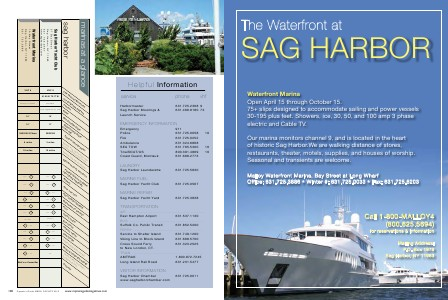 Waterfront Marina Open April 15 through October 15. 75+ slips designed to accommodate sailing and power vessels 30-195 plus feet. Showers, ice, 30, 50, and 100 amp 3 phase electric and Cable TV. Our marina monitors channel 9, and is located in the heart of historic Sag Harbor.We are walking distance of stores, restaurants, theater, motels, supplies, and houses of worship. Seasonal and transients are welcome.