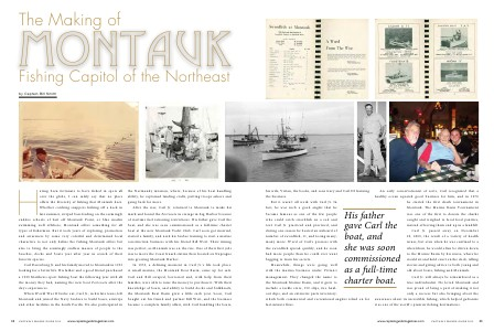 the Normandy invasion, where, because of his boat handling ability, he captained landing crafts, putting troops ashore and going back for more. After the war, Carl Jr. returned to Montauk to make his mark and found the Fortenate in storage in Sag Harbor because of wartime fuel rationing restrictions. His father gave Carl the boat, and she was soon commissioned as a full-time charter boat at the new Montauk Yacht Club. Carl soon got married, started a family, and used his Seabee training to start a marine construction business with his friend Bill Weit. Their timing was perfect, as Montauk was on the rise. One of their first jobs was to move the Coast Guard station then located on Napeague into growing Montauk Harbor. In 1955, a defining moment in Carl Jr.’s life took place. A small marina, the Montauk Boat Basin, came up for sale. Carl and Bill scraped, borrowed and, with help from their families, were able to raise the money to purchase it. With their knowledge of boats, and ability to build docks and bulkheads, the Montauk Boat Basin grew a little each year. Soon, Carl bought out his friend and partner Bill Weit, and the business became a complete family affair, with Carl handling the boats,