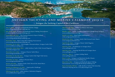 February 24, 2014 – RORC Caribbean 600 Start: www.caribbean600.rorc.org. March 1, 2014 – RORC Caribbean 600 Prize?giving Party, Antigua: www.caribbean600.rorc.org. March 2?3, 2014 – West Indies Sail Regatta: www.antiguayachtclub.com. March 8?9, 2014 – Antigua Yacht Club Annual Laser Open: www.antiguayachtclub.com. April 17?22, 2014 – Antigua Classic Yacht Regatta: www.antiguaclassics.com. April 25, 2014 – Guadeloupe to Antigua Race: www.sailingweek.com. April 26, 2014 – Yachting World Round Antigua Race: www.sailingweek.com. April 27 ? May 2 – Antigua Sailing Week: www.sailingweek.com. May 17, 2014 ? Antigua and Barbuda Marlin Classic: www.antiguabarbudasport? ?shing.com. May 18?19, 2014 – Antigua and Barbuda Sport Fishing Tournament: www.antiguabarbudasport? ?shing.com. Every Saturday All Year – Jolly Harbour Yacht Club Saturday Afternoon Racing Series: www.jhycantigua.com.