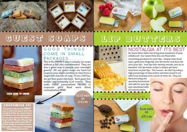 Our guest soaps are the PERFECT way to make your guests feel extra special and they are a great way to say thank you to your party guests. Do you own a Bed and Breakfast or Guest Cabin? We can add your logo to these sweet little soaps! We do all label design & printing in house ~ that makes it SO easy to customize! Click here to learn more!