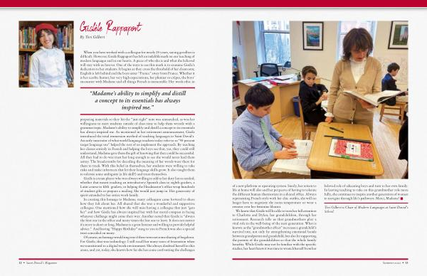 beloved role of educating boys and turn to her own family . In leaving teaching to take on this grandmother role more fully , she continues to inspire another generation of women to navigate through life ’ s pathways . Merci , Madame ! •