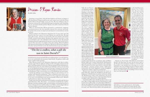 Sometimes you get lucky . Little did Janet Sughrue and I know , in August of 1998 , that Miriam O ’ Regan would become such a major factor in the life of Saint David ’ s School and , personally , in our own lives . We were looking to hire an admissions assistant who could handle all the paperwork , phone work , scheduling , data , etc . associated with this position . Miriam came with so much more than we had ever dreamed .