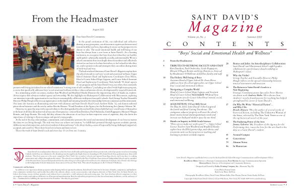 The lead articles of this issue of Saint David ’ s Magazine explore how the school attends to our boys ’ social and emotional wellness . Upper School Assistant Head and Sophrosyne Coordinator Evan Morse , Head of Lower School Hope Lippens , and Lower School Assistant Head and Sophrosyne Coordinator Nick Imbelli ’ 99 detail aspects of our program and the Saint David ’ s way , our ethos , that constantly promote well-being ( articulated in our school ’ s mission as “ a strong sense of self-confidence ”), including our school-wide Sophrosyne program , a course that specifically addresses boys ’ social-emotional wellness within a values and mission-driven , developmentally-targeted framework .