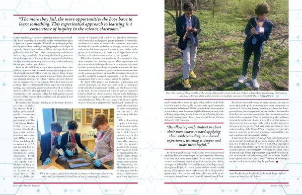 science teachers , get to enjoy observing this process unfold . The boys ’ assembly of moveable pulley systems from piles of parts is a great example . When their quadruple pulley system succeeds in making a hanging weight feel as light as a pencil , teams erupt in cheers . When the rope slacks and pulleys crash to the floor , other teams regroup and discuss their strategy to rebuild . Either way , the learning process is about the experience : Testing a theory in practice by building a simple machine , measuring and recording results , and using data to prove what they observe .