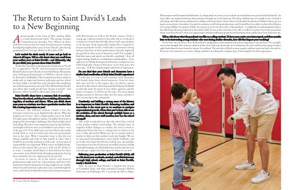Performance and International Relations . Looking back on it now , I can see how my foundation was rooted at Saint David ’ s . As I got older , my musical interests and creativity brought me to the bassoon . The deep , mellow tone of it spoke to me . I found it enriching and I did various auditions for colleges and universities . I knew that even though I loved music I didn ’ t want to go to a music conservatory ; but rather , I wanted to continue a well-balanced education , and I found that I was able to achieve that balance at Carnegie Mellon . In spring of 2020 , my senior year was cut short due to the pandemic . I completed my undergraduate degree the following fall and graduated in December 2020 . It was at this time that I was able to reflect on what I was truly passionate about , and Saint David ’ s offered an opportunity ( Athletics Monitor position ) and transition that couldn ’ t have been better for me .