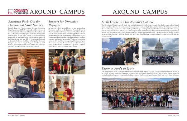In June , the school received letters of appreciation from Ukrainian students at the Benjamin Franklin School in Warsaw , with the following cover note : “ Dear Saint David ’ s School , Thank you for all the love and support you have sent our way this year . Your generosity means the world to us . Our Ukrainian students wanted to share their gratitude — we hope you enjoy our letters of appreciation . Thank you for modeling caring for all !” In addition to supporting Ukrainian refugees , the Community Service Committee sponsored winter / spring drives for Ronald McDonald House , Operation Gratitude , Project Cicero , and Horizons at Saint David ’ s .