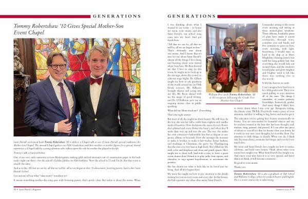 Saint David ’ s welcomed back Tommy Robertshaw ’ 10 to deliver a Chapel talk at one of Saint David ’ s special traditions , the Mother-Son Chapel . The annual Chapel gathers our Fifth Grade boys and their mothers or mother figures for a special , shared experience ; a Chapel talk by a young alumnus who reflects upon the role his mother has played in his life .