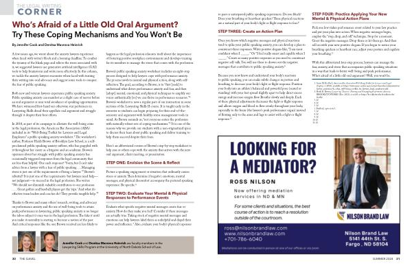 With this abbreviated four-step process , lawyers can manage the fear , anxiety , and stress that accompanies public speaking situations in a way that leads to better well-being and peak performance . Who ’ s afraid of a little old oral argument ? Well , you won ’ t be .