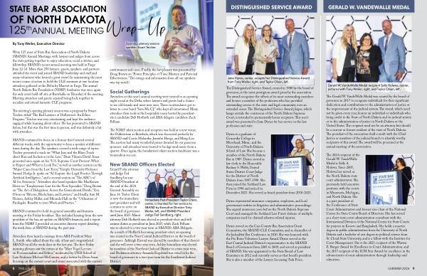 The Gerald W . VandeWalle Medal was created by the board of governors in 2017 to recognize individuals for their significant dedication and contributions to the administration of justice or the improvement of the judicial system . The award , which need not be given every year , honors an individual or individuals who bring credit to the State of North Dakota and its judicial system or to the administration of justice in North Dakota or the United States . The recipient need not be an attorney but should be a current or former resident of the state of North Dakota . The president of the association shall consult with the Chief Justice or members of the judicial branch to identify worthy recipients of this award . The award will be presented at the annual meeting of the association .