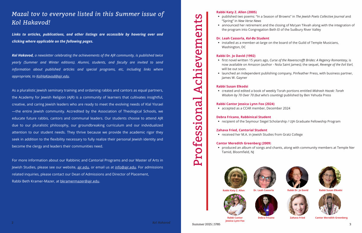 Rabbi Katy Z. Allen( 2005) published two poems:“ In a Season of Browns” in The Jewish Poets Collective Journal and“ Spring” in New Verse News announced her retirement and the closing of Ma ' yan Tikvah along with the integration of the program into Congregation Beth El of the Sudbury River Valley