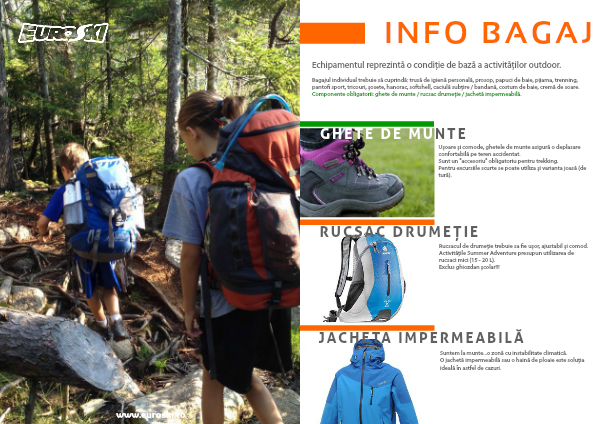 Bagajul individual trebuie să cuprindă: trusă de igienă personală, prosop, papuci de baie, pijama, trenning, pantofi sport, tricouri, șosete, hanorac, softshell, caciulă subțire / bandană, costum de baie, cremă de soare.