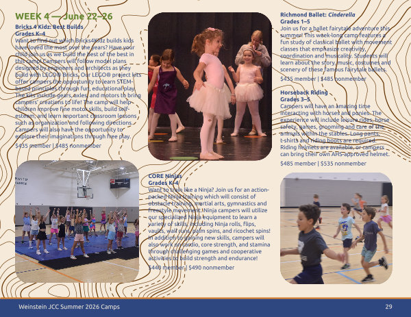 Bricks 4 Kidz: Best Builds Grades K – 4 Want to find out which Bricks4Kidz builds kids have loved the most over the years? Have your child join us as we build the best of the best in this camp! Campers will follow model plans designed by engineers and architects as they build with LEGO ® Bricks. Our LEGO ® project kits offer campers the opportunity to learn STEMbased principles through fun, educational play. The kits include gears, axles, and motors to bring campers’ creations to life! The camp will help children improve fine motor skills, build selfesteem, and learn important classroom lessons such as organization and following directions. Campers will also have the opportunity to explore their imaginations through free play.