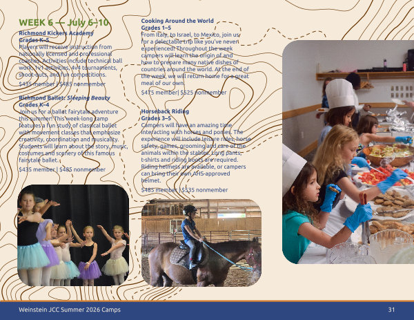 Cooking Around the World Grades 1 – 5 From Italy, to Israel, to Mexico, join us for a delectable trip like you ' ve never experienced! Throughout the week campers will learn the origin of and how to prepare many native dishes of countries around the world. At the end of the week, we will return home for a great meal of our own.