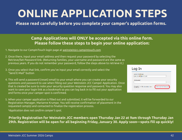 4. This will send a password( reset) email to your email where you can create your security questions and password to use when filling out your Weinstein JCC Camper Application. Once that is created be sure to note your security question response and password. You may also want to save your login link as a bookmark so you can log back in to fill out your application and forms once your camper spot is confirmed.