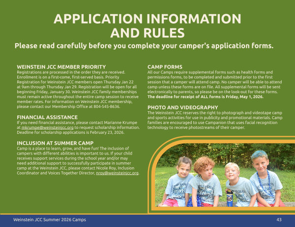 Registrations are processed in the order they are received. Enrollment is on a first-come, first-served basis. Priority Registration for Weinstein JCC members open Thursday Jan 22 at 9am through Thursday Jan 29. Registration will be open for all beginning Friday, January 30. Weinstein JCC family memberships must remain active throughout the entire camp session to receive member rates. For information on Weinstein JCC membership, please contact our Membership Office at 804-545-8636.