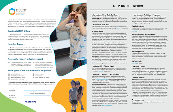 For information on Inclusion services or to arrange accommodation, contact Glenview Park District’ s NSSRA Inclusion Liaison, Natalie Liang, at( 224) 521-2552 or natalie. liang @ glenviewparks. org.