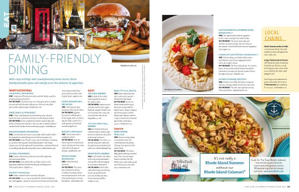 BRICK PIZZA CO., BRISTOL VIBE: Rustic Italian favorites and creative pizza specials— all fresh from the hearth. ON THE MENU: Go all-out Rhode Island with the spicy Bristol pie, topped with fra diavolo sauce, chouriço, linguiça and cherry peppers, and the Rhody-style calamari coated in crispy cornmeal and served with garlic butter and banana peppers. brickpizzaco. com
