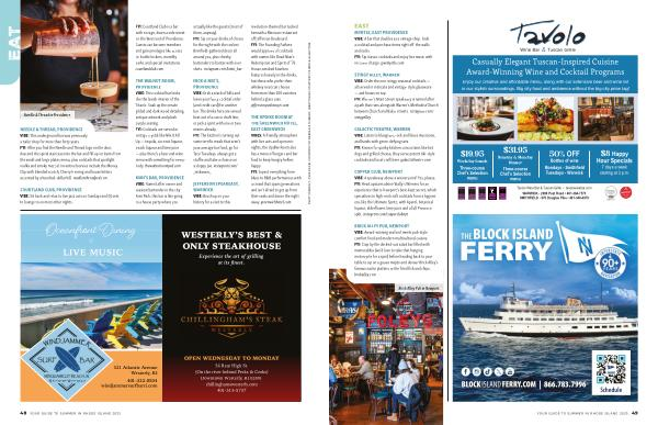 NEEDLE & THREAD, PROVIDENCE VIBE: This underground bar was previously a tailor shop for more than forty years. FYI: After you find the Needle and Thread logo on the door, descend the spiral staircase into the bar and fill up on items from the small and large plates menu, plus cocktails that spotlight vodka and smoky mezcal. Inventive bevvies include the Money Clip with blended scotch, Cherry Heering and house bitters accented by a hundred-dollar bill. needlenthreadpvd. com
