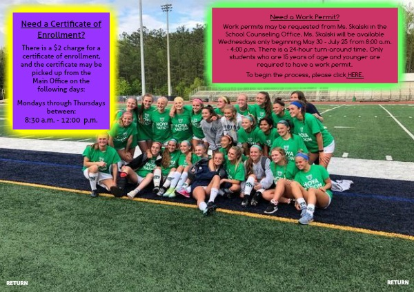 Work permits may be requested from Ms. Skalski in the School Counseling Office. Ms. Skalski will be available Wednesdays only beginning May 30 - July 25 from 8:00 a.m. - 4:00 p.m. There is a 24-hour turn-around time. Only students who are 15 years of age and younger are required to have a work permit.
