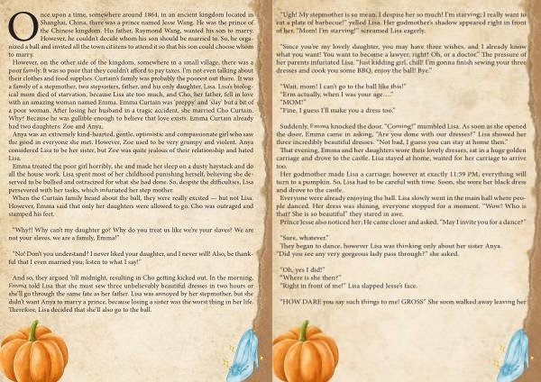 Suddenly , Emma knocked the door . “ Coming !” mumbled Lisa . As soon as she opened the door , Emma came in asking , “ Are you done with our dresses ?” Lisa showed her three incredibly beautiful dresses . “ Not bad , I guess you can stay at home then .” That evening , Emma and her daughters wore their lovely dresses , sat in a huge golden carriage and drove to the castle . Lisa stayed at home , waited for her carriage to arrive too . Her godmother made Lisa a carriage ; however at exactly 11:59 PM , everything will turn to a pumpkin . So , Lisa had to be careful with time . Soon , she wore her black dress and drove to the castle . Everyone were already enjoying the ball . Lisa slowly went in the main hall where people danced . Her dress was shining , everyone stopped for a moment . “ Wow ! Who is that ? She is so beautiful ” they stared in awe . Prince Jesse also noticed her ; He came closer and asked , “ May I invite you for a dance ?”