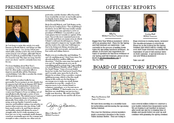 Happy New Year WDALA members! 2018 is off to an amazing start. Plans for the Spring and Fall Seminars are underway. I am currently in the process of nailing down topics for upcoming luncheon webinars. As always, if you have any suggestions for topics or speakers for luncheon webinars or our Spring and Fall Seminars, please let me know at gfry@serklandlaw.com or 701-751-7355.