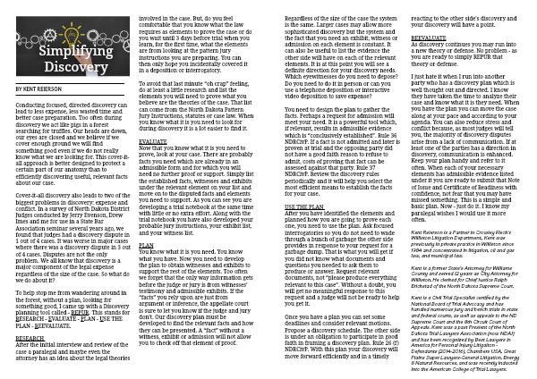 Cover-it-all discovery also leads to two of the biggest problems in discovery: expense and conflict. In a survey of North Dakota District Judges conducted by Jerry Evenson, Drew Imes and me for use in a State Bar Association seminar several years ago, we found that judges had a discovery dispute in 1 out of 4 cases. It was worse in major cases where there was a discovery dispute in 3 out of 4 cases. Disputes are not the only problem. We all know that discovery is a major component of the legal expense regardless of the size of the case. So what do we do about it?