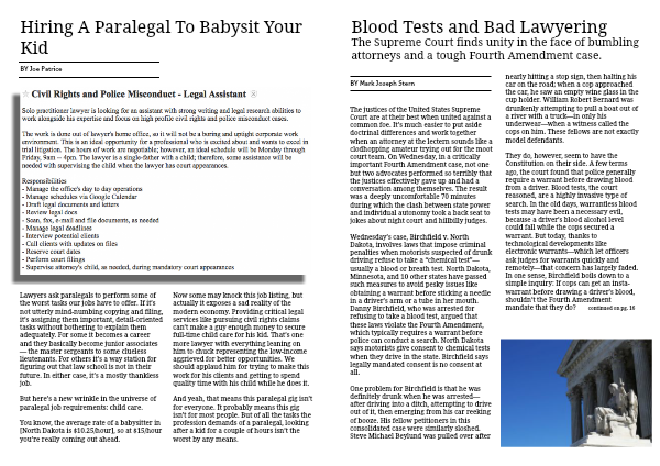 They do, however, seem to have the Constitution on their side. A few terms ago, the court found that police generally require a warrant before drawing blood from a driver. Blood tests, the court reasoned, are a highly invasive type of search. In the old days, warrantless blood tests may have been a necessary evil, because a driver’s blood alcohol level could fall while the cops secured a warrant. But today, thanks to technological developments like electronic warrants—which let officers ask judges for warrants quickly and remotely—that concern has largely faded. In one sense, Birchfield boils down to a simple inquiry: If cops can get an insta-warrant before drawing a driver’s blood, shouldn’t the Fourth Amendment mandate that they do? continued on pg. 16