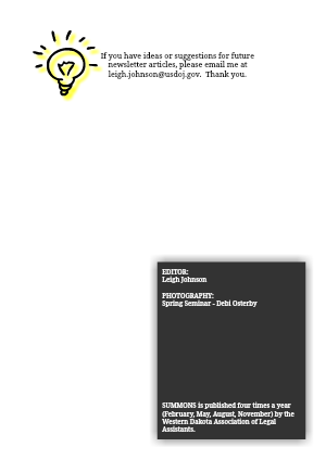 SUMMONS is published four times a year (February, May, August, November) by the Western Dakota Association of Legal Assistants.