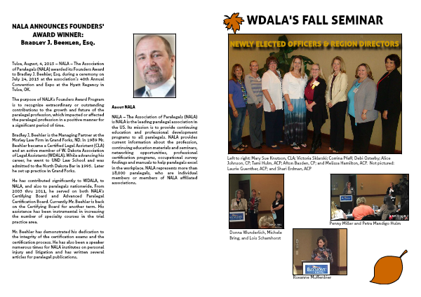 Tulsa, August, 4, 2015 – NALA – The Association of Paralegals (NALA) awarded its Founders Award to Bradley J. Beehler, Esq. during a ceremony on July 24, 2015 at the association’s 40th Annual Convention and Expo at the Hyatt Regency in Tulsa, OK.