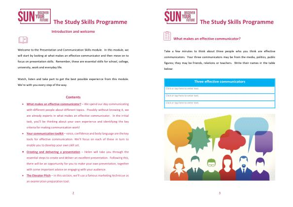 Welcome to the Presentation and Communication Skills module . In this module , we will start by looking at what makes an effective communicator and then move on to focus on presentation skills . Remember , these are essential skills for school , college , university , work and everyday life .