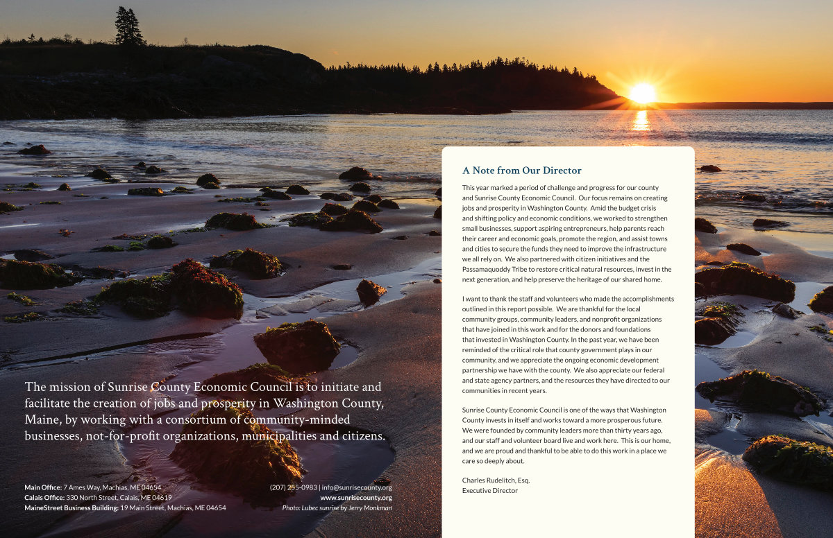 The mission of Sunrise County Economic Council is to initiate and facilitate the creation of jobs and prosperity in Washington County, Maine, by working with a consortium of community-minded businesses, not-for-profit organizations, municipalities and citizens.