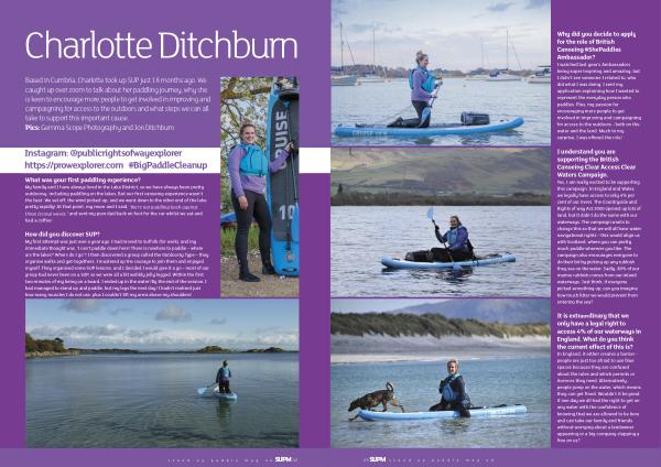 Based in Cumbria , Charlotte took up SUP just 18 months ago . We caught up over zoom to talk about her paddling journey , why she is keen to encourage more people to get involved in improving and campaigning for access to the outdoors and what steps we can all take to support this important cause . Pics : Gemma Scope Photography and Jon Ditchburn