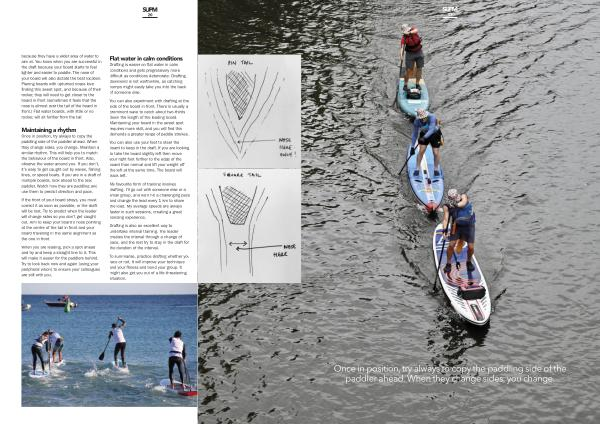 Once in position , try always to copy the paddling side of the paddler ahead . When they change sides , you change . Maintain a similar rhythm . This will help you to match the behaviour of the board in front . Also , observe the water around you . If you don ’ t , it ’ s easy to get caught out by waves , fishing lines , or speed boats . If you are in a draft of multiple boards , look ahead to the lead paddler . Watch how they are paddling and use them to predict direction and pace .