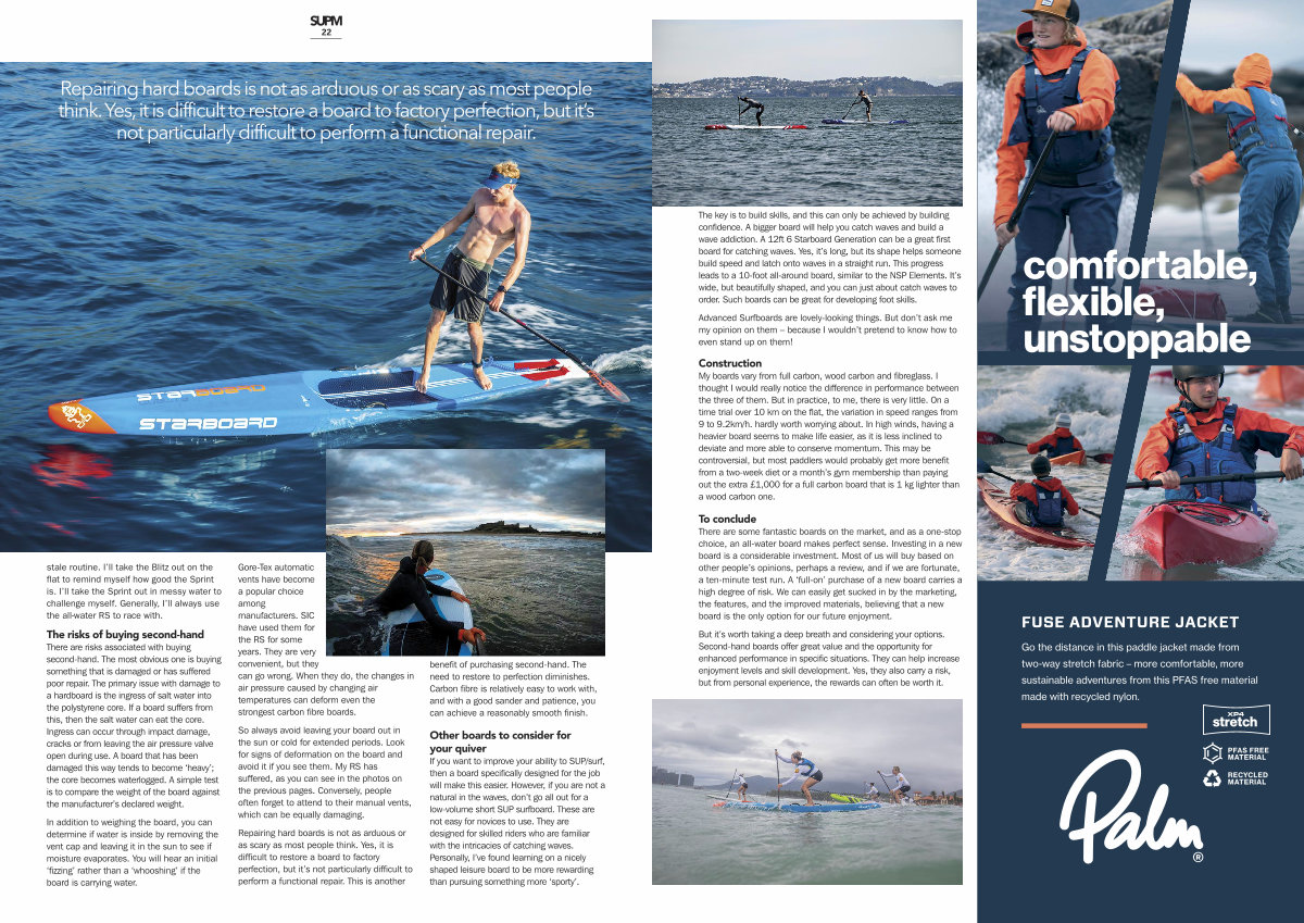 Construction My boards vary from full carbon, wood carbon and fibreglass. I thought I would really notice the difference in performance between the three of them. But in practice, to me, there is very little. On a time trial over 10 km on the flat, the variation in speed ranges from 9 to 9.2km / h. hardly worth worrying about. In high winds, having a heavier board seems to make life easier, as it is less inclined to deviate and more able to conserve momentum. This may be controversial, but most paddlers would probably get more benefit from a two-week diet or a month’ s gym membership than paying out the extra £ 1,000 for a full carbon board that is 1 kg lighter than a wood carbon one.