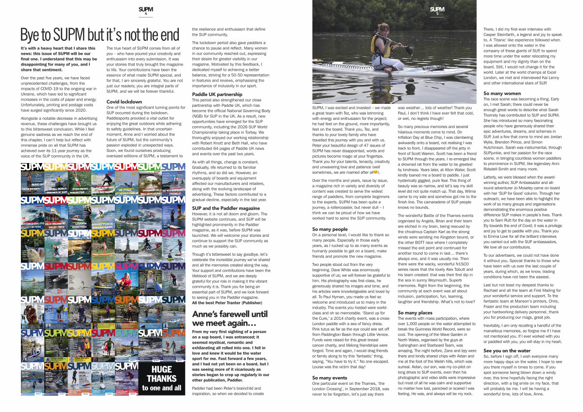 Though it’ s bittersweet to say goodbye, let’ s celebrate the incredible journey we’ ve shared and all the memories created along the way. Your support and contributions have been the lifeblood of SUPM, and we are deeply grateful for your role in making it the vibrant community it is. Thank you for being an essential part of SUPM, and we look forward to seeing you in the Paddler magazine. All the best Peter Tranter( Publisher)