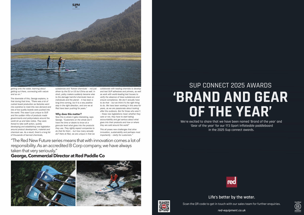 The downside of this, George explains, is that during that time,“ There was a lot of rushed board production as factories went into overdrive to meet this new demand and lots of low-quality boards were pushed into the world. This wasn’ t just unique to SUP, and the sudden influx of products made governments and policymakers around the world sit up and take notice. They were forced to take swift action, quickly developing and establishing new legislation around product development, material and chemical use. As a result, there’ s a long list of thousands of banned chemicals, substances and‘ forever chemicals’ – not just driven by the EU or US but China as well. In short, policy makers suddenly became wise to the damage harmful chemicals have on individuals and the planet – it has been a long time coming, but it is a very positive step in the right direction, and one we at Red have been pushing for years.”