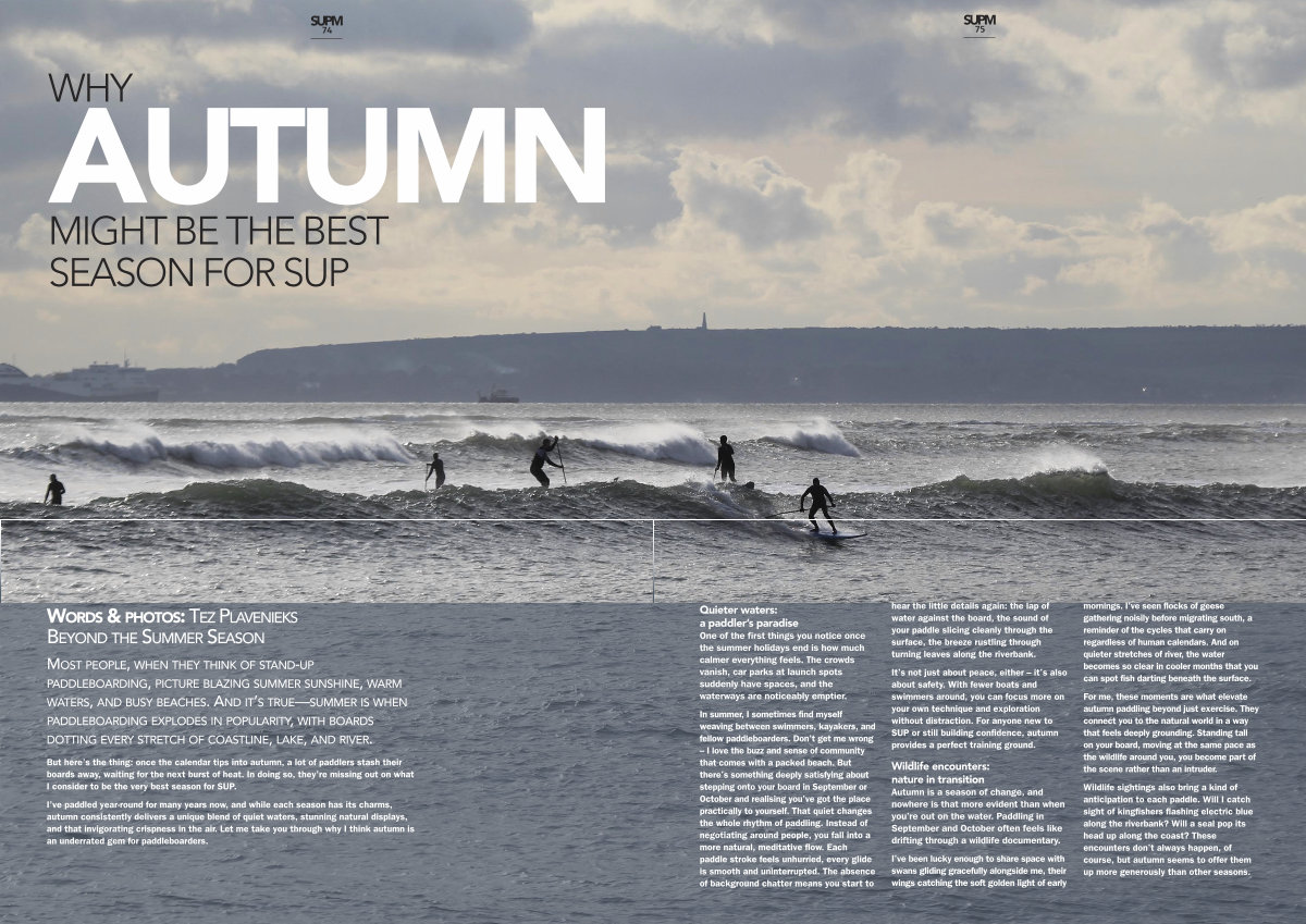 In summer, I sometimes find myself weaving between swimmers, kayakers, and fellow paddleboarders. Don’ t get me wrong – I love the buzz and sense of community that comes with a packed beach. But there’ s something deeply satisfying about stepping onto your board in September or October and realising you’ ve got the place practically to yourself. That quiet changes the whole rhythm of paddling. Instead of negotiating around people, you fall into a more natural, meditative flow. Each paddle stroke feels unhurried, every glide is smooth and uninterrupted. The absence of background chatter means you start to hear the little details again: the lap of water against the board, the sound of your paddle slicing cleanly through the surface, the breeze rustling through turning leaves along the riverbank.