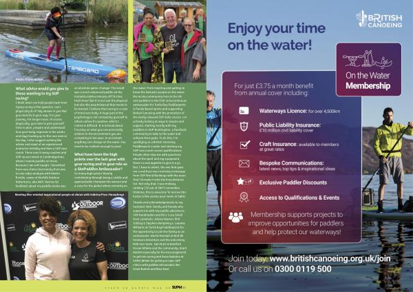Meeting like-minded inspirational people at shows with Sabrina Pace-Humphreys the water . From meeting and getting to know the fantastic people on the water , the racing community here in the UK and paddlers in the USA , to becoming an ambassador for Turtle Bay Paddlesports & Panda Board Sports and supporting British Canoeing with the promotion of the newly released SUP Safer course . I ’ m actively looking at ways to inspire and support , starting locally with my paddlers in SUP Huntingdon , a Facebook community to take to the water and achieve their goals . To do this , I ’ m qualifying as a British Canoeing Paddlesports Leader and starting my SUP race coach course qualifications . People often stop me with questions about the sport and my equipment ; there ’ s a real appetite to give it a go . But , I have to admit , the one that gave me a real buzz was receiving a message from SUP World Rankings with the news that I ’ d made it onto the long distance list . Not only that , I was midway , ranking 122 out of 280 ! I remember thinking , this is amazing ! To receive this kudos is like seeing your name in lights .
