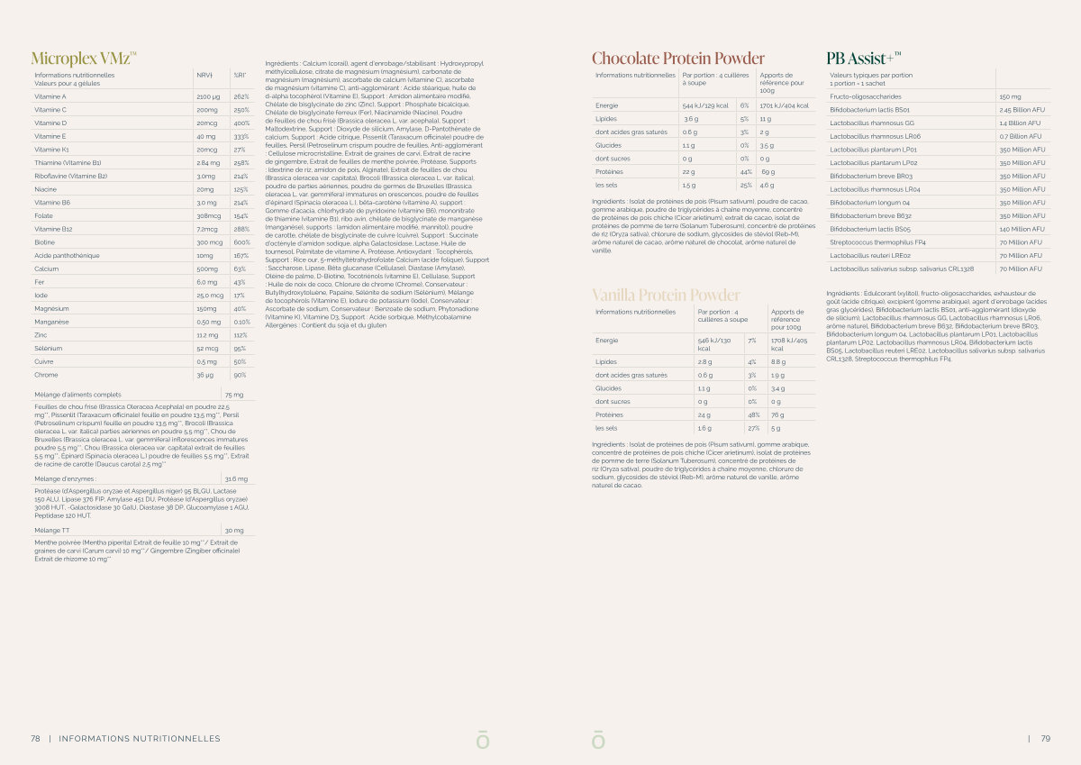Ingrédients: Isolat de protéines de pois( Pisum sativum), gomme arabique, concentré de protéines de pois chiche( Cicer arietinum), isolat de protéines de pomme de terre( Solanum Tuberosum), concentré de protéines de riz( Oryza sativa), poudre de triglycérides à chaîne moyenne, chlorure de sodium, glycosides de stéviol( Reb-M), arôme naturel de vanille, arôme naturel de cacao.