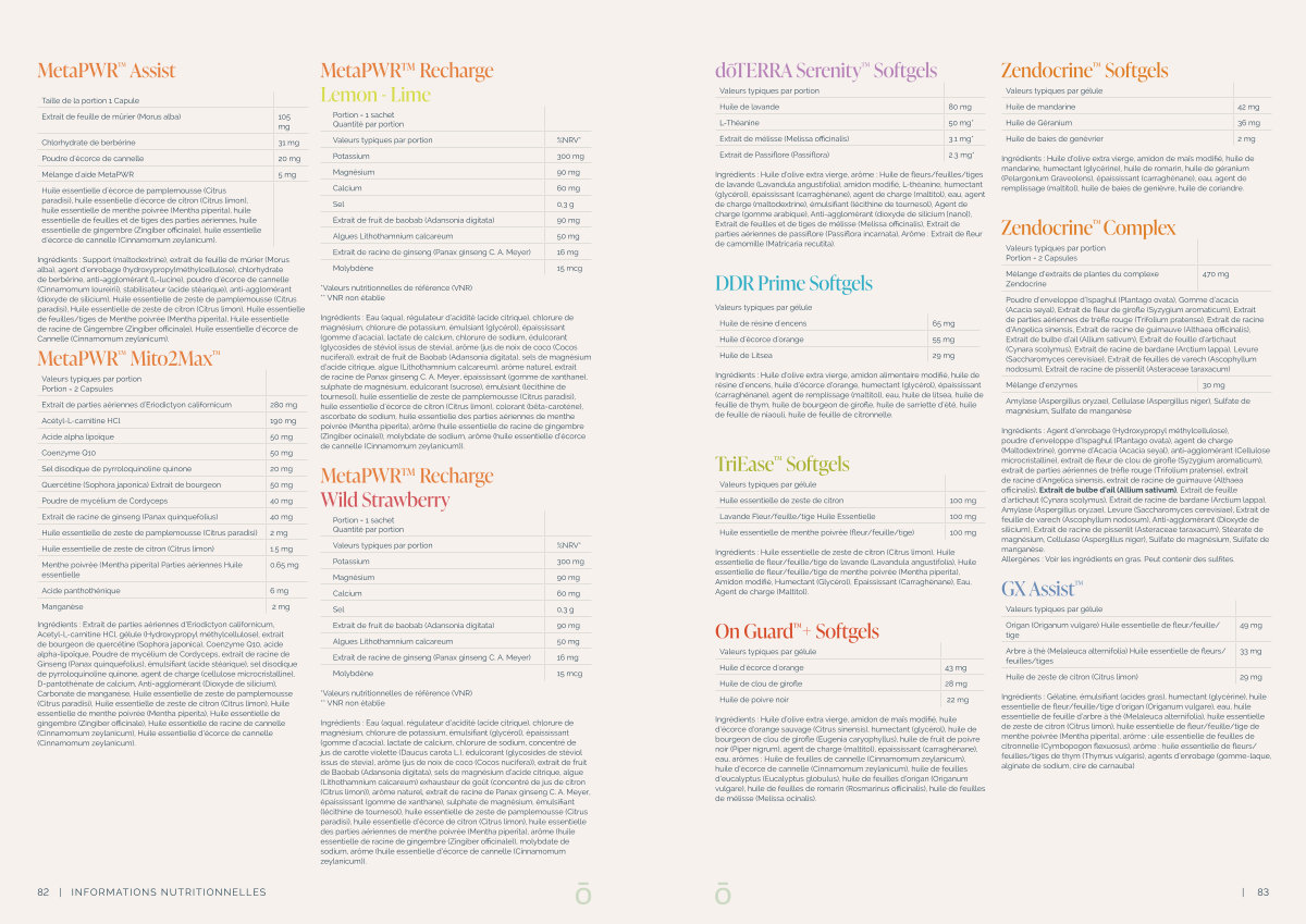 Valeurs typiques par gélule Huile essentielle de zeste de citron Lavande Fleur / feuille / tige Huile Essentielle Huile essentielle de menthe poivrée( fleur / feuille / tige)