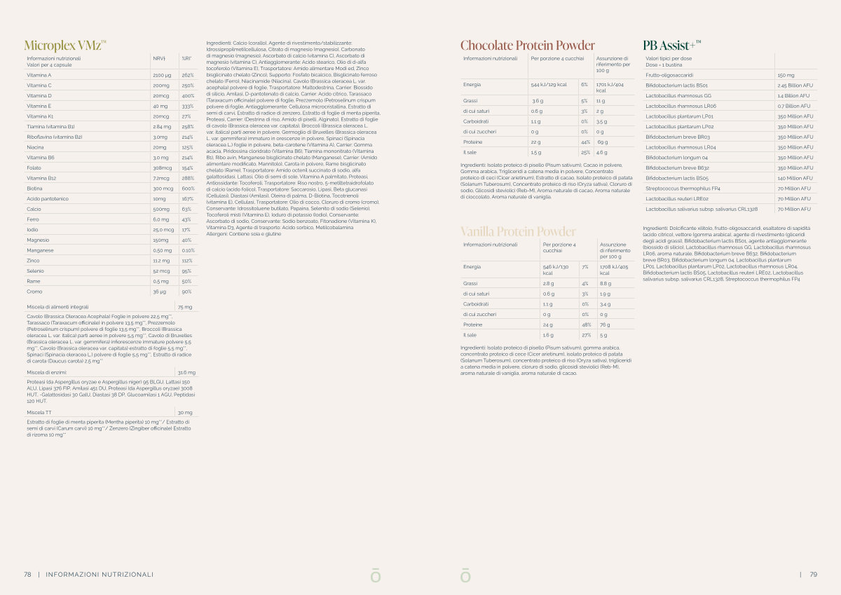Ingredienti: Calcio( corallo), Agente di rivestimento / stabilizzante: Idrossipropilmetilcellulosa, Citrato di magnesio( magnesio), Carbonato di magnesio( magnesio), Ascorbato di calcio( vitamina C), Ascorbato di magnesio( vitamina C), Antiagglomerante: Acido stearico, Olio di d-alfa tocoferolo( Vitamina E), Trasportatore: Amido alimentare Modi ed, Zinco bisglicinato chelato( Zinco), Supporto: Fosfato bicalcico, Bisglicinato ferroso chelato( Ferro), Niacinamide( Niacina), Cavolo( Brassica oleracea L. var. acephala) polvere di foglie, Trasportatore: Maltodestrina, Carrier: Biossido di silicio, Amilasi, D-pantotenato di calcio, Carrier: Acido citrico, Tarassaco( Taraxacum officinale) polvere di foglie, Prezzemolo( Petroselinum crispum polvere di foglie, Antiagglomerante: Cellulosa microcristallina, Estratto di semi di carvi, Estratto di radice di zenzero, Estratto di foglie di menta piperita, Proteasi, Carrier:( Destrina di riso, Amido di piselli, Alginato), Estratto di foglie di cavolo( Brassica oleracea var. capitata), Broccoli( Brassica oleracea L. var. italica) parti aeree in polvere, Germoglio di Bruxelles( Brassica oleracea L. var. gemmifera) immaturo in orescenze in polvere, Spinaci( Spinacia oleracea L.) foglie in polvere, beta-carotene( Vitamina A), Carrier: Gomma acacia, Piridossina cloridrato( Vitamina B6), Tiamina mononitrato( Vitamina B1), Ribo avin, Manganese bisglicinato chelato( Manganese), Carrier:( Amido alimentare modificato, Mannitolo), Carota in polvere, Rame bisglicinato chelato( Rame), Trasportatore: Amido octenil succinato di sodio, alfa galattosidasi, Lattasi, Olio di semi di sole, Vitamina A palmitato, Proteasi, Antiossidante: Tocoferoli, Trasportatore: Riso nostro, 5-metiltetraidrofolato di calcio( acido folico), Trasportatore: Saccarosio, Lipasi, Beta glucanasi( Cellulasi), Diastasi( Amilasi), Oleina di palma, D-Biotina, Tocotrienoli( vitamina E), Cellulasi, Trasportatore: Olio di cocco, Cloruro di cromo( cromo), Conservante: Idrossitoluene butilato, Papaina, Selenito di sodio( Selenio), Tocoferoli misti( Vitamina E), Ioduro di potassio( Iodio), Conservante: Ascorbato di sodio, Conservante: Sodio benzoato, Fitonadione( Vitamina K), Vitamina D3, Agente di trasporto: Acido sorbico, Metilcobalamina Allergeni: Contiene soia e glutine