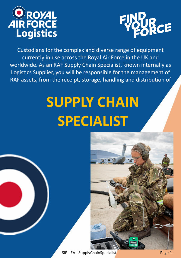 Custodians for the complex and diverse range of equipment currently in use across the Royal Air Force in the UK and worldwide. As an RAF Supply Chain Specialist, known internally as Logistics Supplier, you will be responsible for the management of RAF assets, from the receipt, storage, handling and distribution of