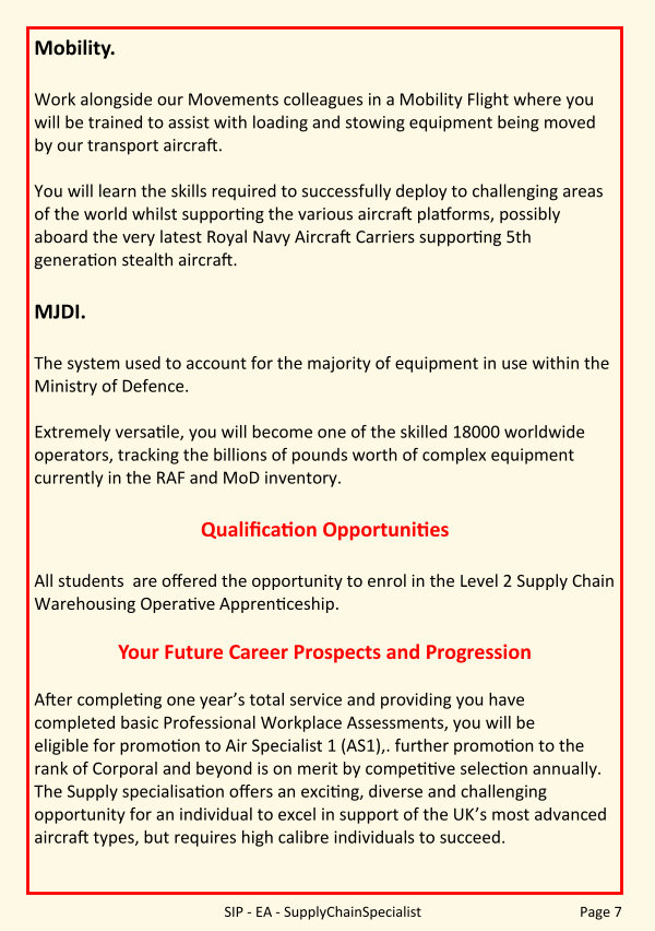 After completing one year’ s total service and providing you have completed basic Professional Workplace Assessments, you will be eligible for promotion to Air Specialist 1( AS1),. further promotion to the rank of Corporal and beyond is on merit by competitive selection annually. The Supply specialisation offers an exciting, diverse and challenging opportunity for an individual to excel in support of the UK’ s most advanced aircraft types, but requires high calibre individuals to succeed.
