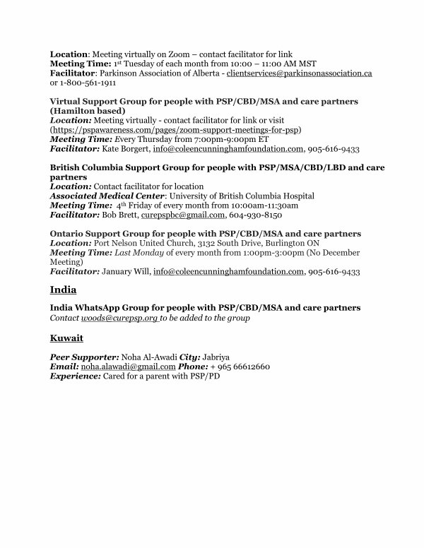 Virtual Support Group for people with PSP / CBD / MSA and care partners( Hamilton based) Location: Meeting virtually- contact facilitator for link or visit( https:// pspawareness. com / pages / zoom-support-meetings-for-psp) Meeting Time: Every Thursday from 7:00pm-9:00pm ET Facilitator: Kate Borgert, info @ coleencunninghamfoundation. com, 905-616-9433