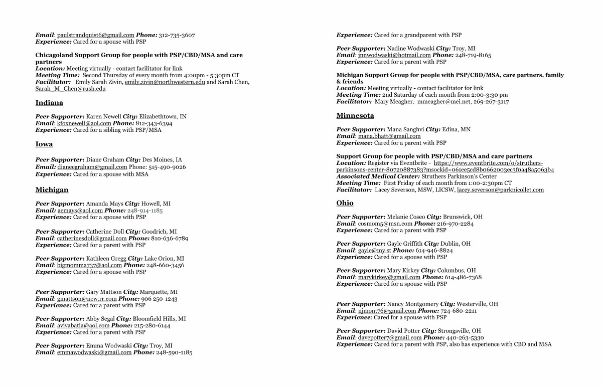 Michigan Support Group for people with PSP / CBD / MSA, care partners, family & friends Location: Meeting virtually- contact facilitator for link Meeting Time: 2nd Saturday of each month from 2:00-3:30 pm Facilitator: Mary Meagher, mmeagher @ mei. net, 269-267-3117