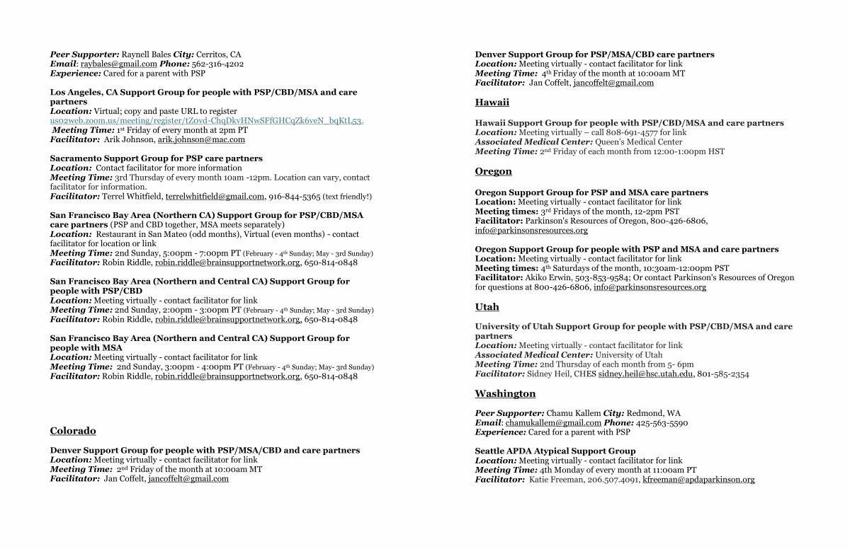 Los Angeles, CA Support Group for people with PSP / CBD / MSA and care partners Location: Virtual; copy and paste URL to register us02web. zoom. us / meeting / register / tZ0vd-ChqDkvHNwSFfGHCqZk6veN _ bqKtL53. Meeting Time: 1 st Friday of every month at 2pm PT Facilitator: Arik Johnson, arik. johnson @ mac. com