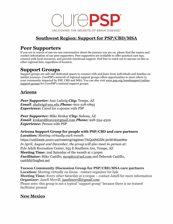 Arizona Support Group for people with PSP / CBD and care partners Location: Meeting virtually each month: https:// us02web. zoom. us / meeting / register / 7XiQo0NGSN-jbrWrWzaeWw In April, August and December, the group will also meet in-person at: Pyle Adult Recreation Center, 655 E Southern Ave, Tempe, AZ Meeting Time: 2nd Saturday of the month at 1:30pm Facilitator: Mike Castillo, mcnphx1 @ aol. com and Deborah Castillo, castild @ hughes. net